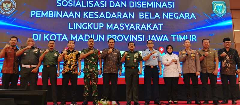 Turut hadir pula Wali Kota Madiun, Dr. Drs. H. Maidi, M.M., M.Pd., serta unsur Forkopimda setempat, memperkuat kolaborasi antara pemerintah pusat dan daerah dalam pengarusutamaan nilai-nilai bela negara di masyarakat.