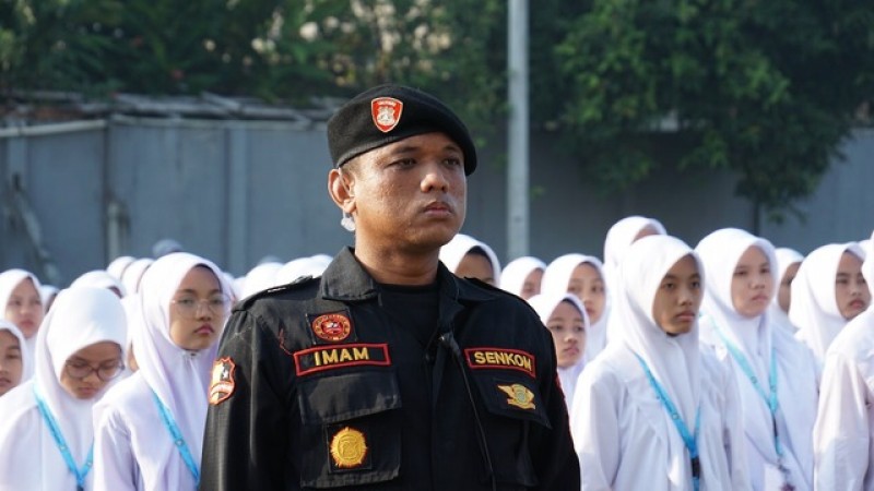 Tampak kanan, Inspektur upacara Marsma TNI (Pur) H. Sukur, M.Si (Han) dan pasukan pengibar bendera HUT Ke-80 RI dari siswa/santri Ponpes Minhaajurrosyidin di di Lapangan Kampus STAiMI, Lubang Buaya, Cipayung, Jakarta Timur, Minggu pagi (17/8/2025).