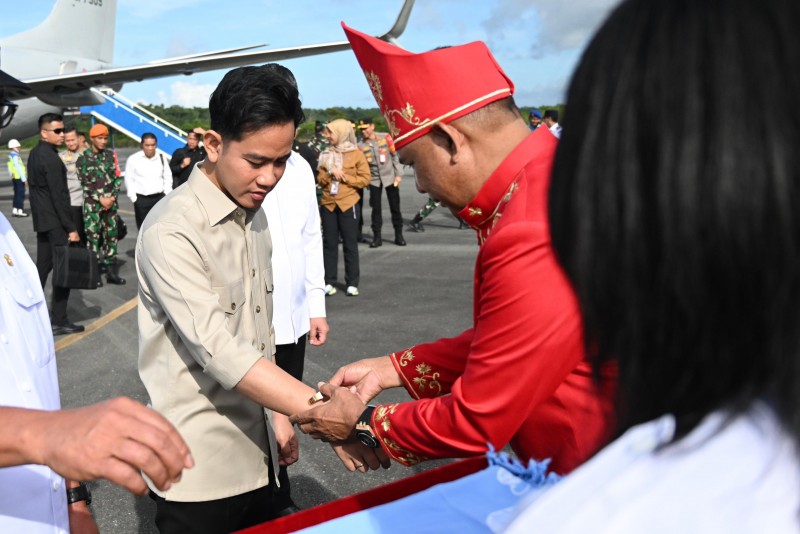 Wakil Presiden (Wapres) Gibran Rakabuming menerima penyambutan hangat melalui upacara adat Kei Rinin setibanya di Bandar Udara Karel Sadsuitubun, Langgur, Rabu (15/10/2025).
