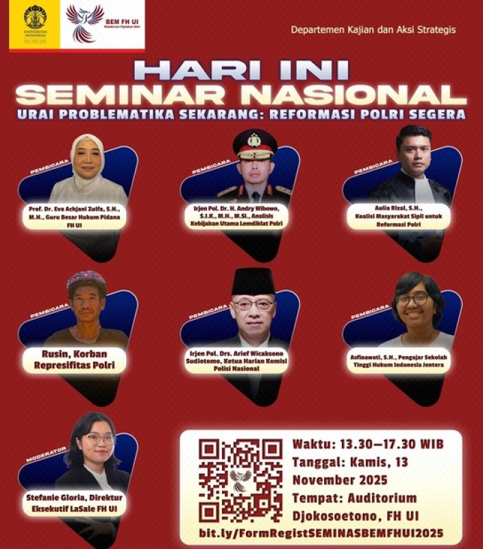 DEPOK - Dalam upaya mendorong pembaruan institusi kepolisian yang lebih humanis, akuntabel, dan berpihak pada keadilan, Badan Eksekutif Mahasiswa Fakultas Hukum Universitas Indonesia (BEM FH UI) 2025 menggelar Seminar Nasional bertema “Reformasi Polri: Urai Problematika Sekarang, Reformasi Polri Segera.”